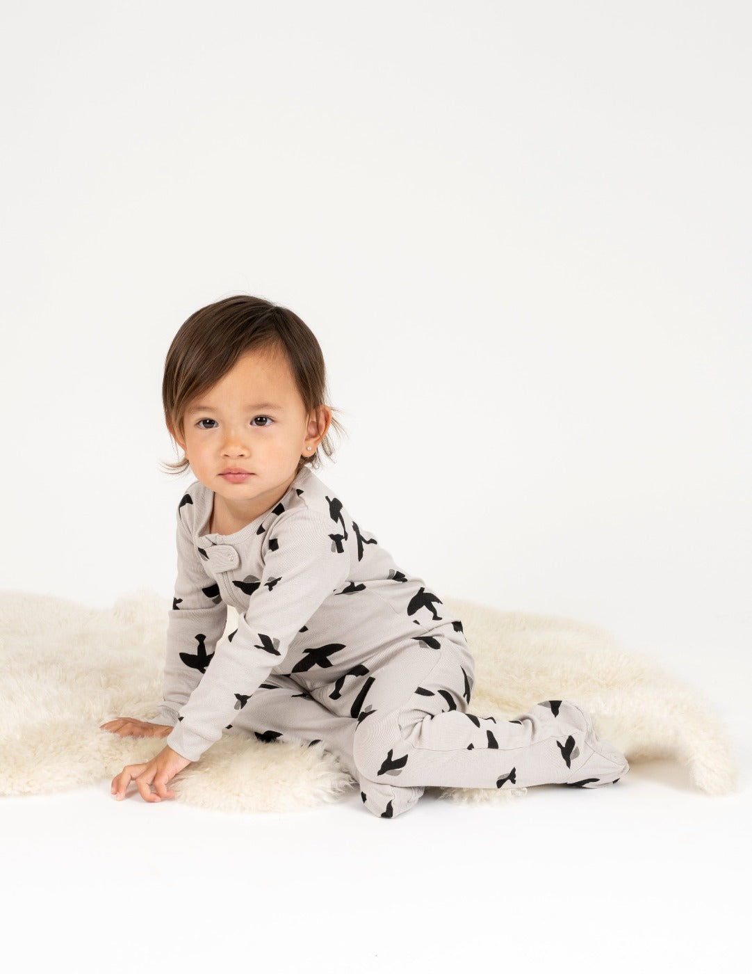 Any little one who is a bird lover will instantly fall in love with the adorable Kids Footed Grey Bird Pajamas. These imported pajamas have a design consisting of a grey background with a flock of birds across the entire body, which is easily matchable with our other grey bird pajamas for men, women, and even pets. The 100% cotton makeup goes well with the tight fit and ribbed cuffs at the ankle and wrist. Its snug fit is the best deterrent for any potential fire hazards, and will keep your child comfortable and safe. Because of its cotton material, sizes will shrink after the first washes by a couple of inches. We recommend sizing up for a more desirable feel. Your little one is sure to find the best fit, as our sizes range from less than 3 months old to 5 years of age! Kids Footed Grey Bird Pajamas are the perfect set to match with the entire family for cute pictures or any festive holiday!