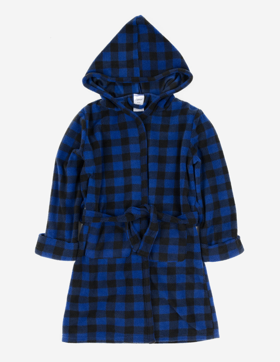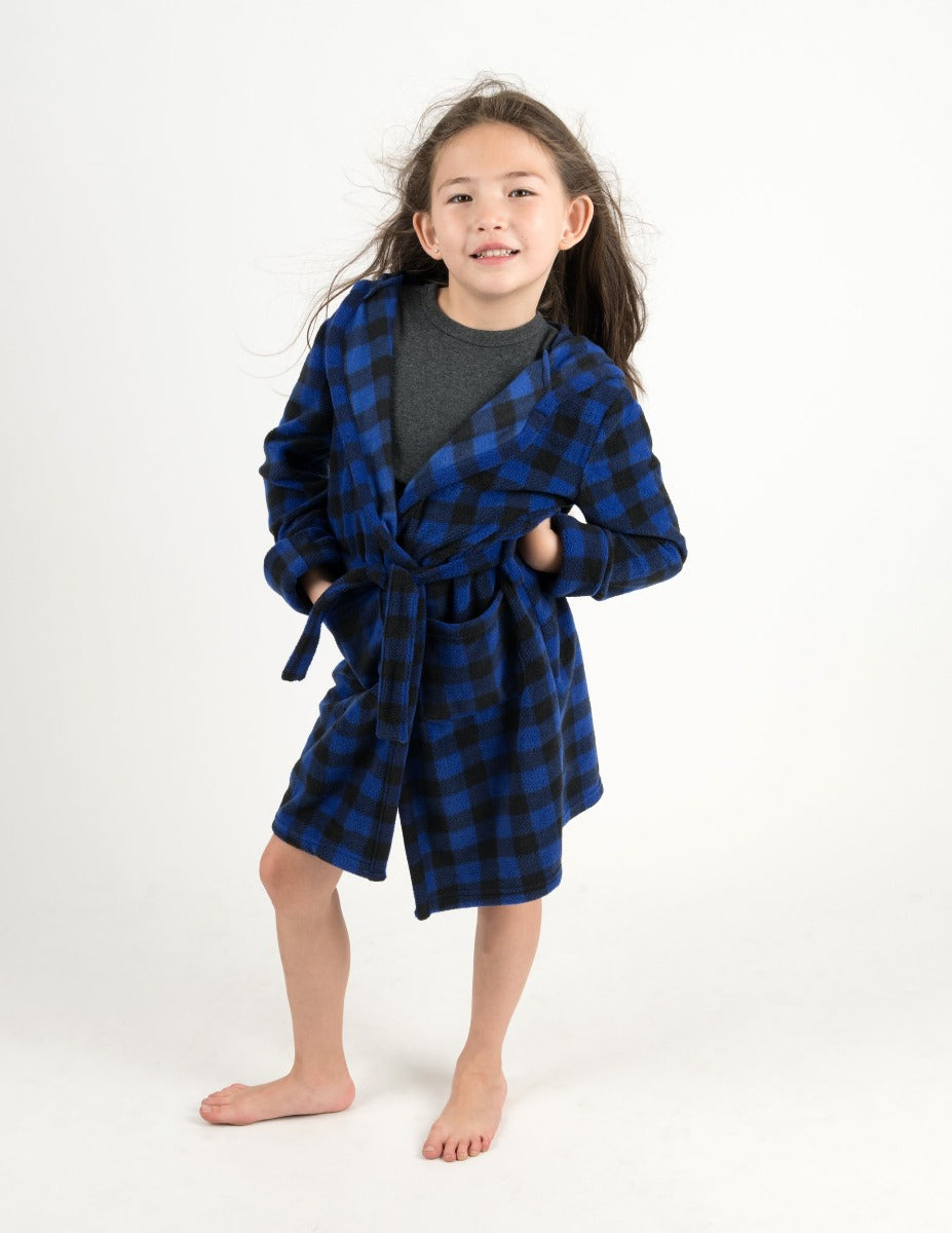 Kids Black & Navy Plaid Fleece Hooded Robe