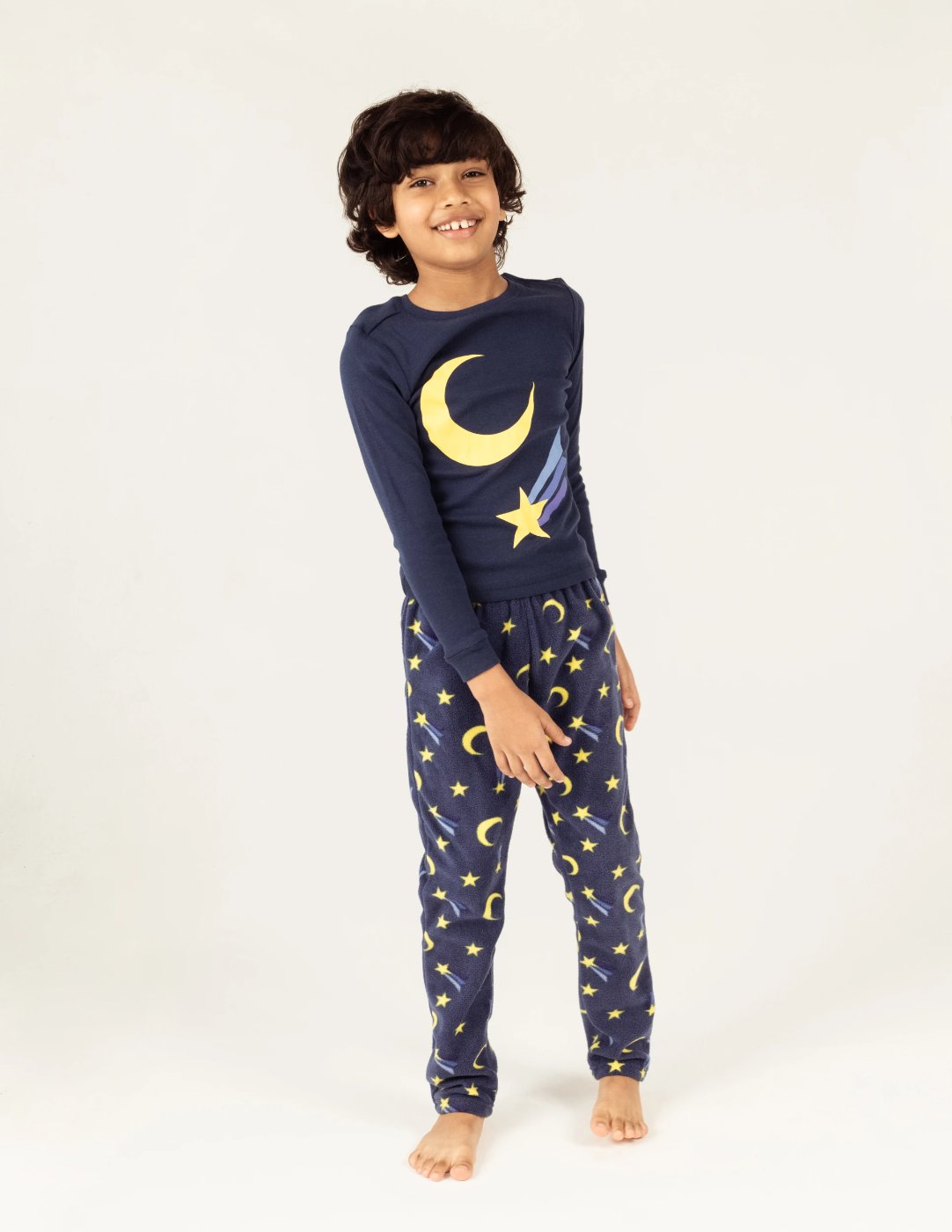 Stylish comfort is guaranteed for your little one in the Kids Moon Fleece Set, and they’ll receive the best night of rest. Each unique product is made of a two-piece set, featuring a slim-fitting long-sleeve shirt to complement the elastic bottoms. The shirt consists of a 100% cotton material, while the pants are an equally comfortable 100% polyester. Its navy-colored design also goes well with the yellow moons and shooting stars that are across the entire set. Not only is the polyester flame resistant, but every set is specially designed to be snug fitting to protect wearers from fire dangers. Sizes are available from 2 to 14 years old and come with tagless labels to prevent exposed skin from scratches. Be sure to match your child with the rest of the family in the Kids Moon Fleece Set!