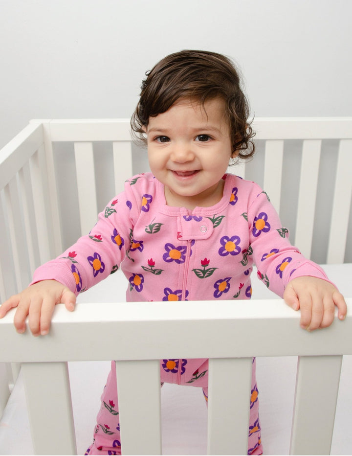 These Baby Footed Flower Pot Pajamas come in our top baby-approved prints. They are tagless, ultra-soft, and made from 100% cotton. Our natural design is free of flame-retardant chemicals and fits snugly for safety. If you like your pajamas a bit looser, please order a size up. To minimize natural shrinking, wash your pajamas inside out and in cold water. The full-body zipper and button closure make changing easy. Our anti-slip gripped footies keep your little ones safe on all of their adventures. You can match your whole family as the Baby Footed Pajamas come in all sizes for adults, dogs, and even dolls!