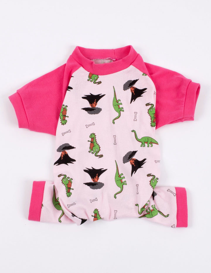 Every pet is promised to look stylish and feel comfortable with the Jurassic-themed Dog Pink Dinosaur Pajamas. These dazzling pajamas consist of 100% cotton and are designed with pink sleeves and dinosaurs. Every product is specially made with 4 holes for each paw while perfectly complementing the elastic, loose feel. Pajama bottoms are also open, providing extra mobility and leisure for your pup. The special outside labels will also protect your pet’s skin, with the clothing being machine wash cold inside out. Sizes are offered from X-Small to XXX-Large, however, sizes will shrink due to the natural cotton makeup. We recommend choosing a size larger if you wish your pup to have a looser feel. Dog Pink Dinosaur Pajamas will match seamlessly with other dino-themed family sets, and everyone can be matching for a festive celebration!