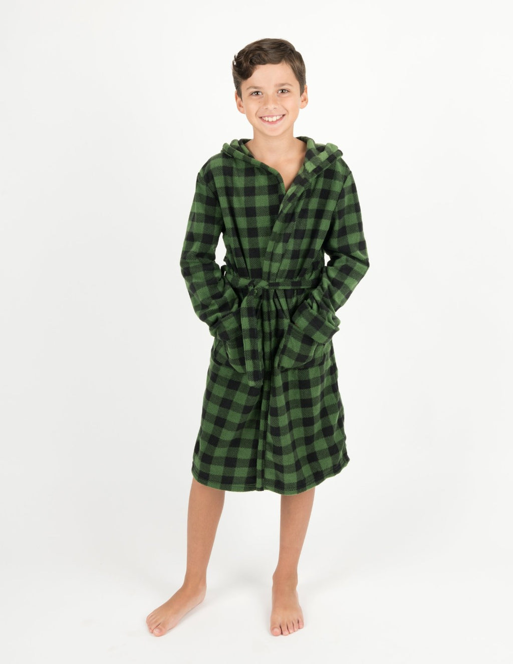 Any child is bound to enjoy their own robe, and the Kids Black & Green Plaid Fleece Hooded Robe provides the stylish comfort they desire. These specially imported products consist of a long-sleeved robe that includes a hood, frontal pockets, and a self-tying belt at the waist. Not only is this robe convenient, but its comfy fit is sure to provide the best feel for those chilly nights. Available sizes from 2 to 14 years old and every robe is made of 100% flame-resistant polyester. Products are machine wash cold inside out, and implement tagless labels to protect skin from scratches. The Kids Black & Green Plaid Fleece Hooded Robe will easily match with other similar family sets, and the whole house will enjoy every cozy moment!