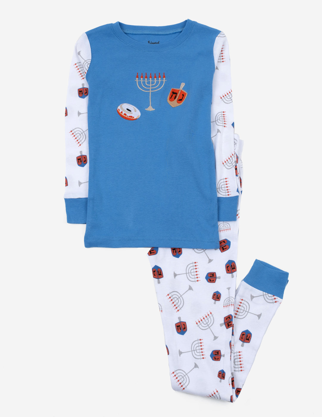 The Kids Hannukkah Menorah Cotton Pajamas are essential for staying warm and festive for this holiday season. These imported products are a two-piece set consisting of a long-sleeved shirt and pants, both with ribbed cuffs. It also has a pattern of Menorahs and dreidels on the sleeves and bottoms to complement the blue-colored shirt. Pajamas have a 100% cotton makeup and are offered in sizes 12 months to 14 years old. To ensure their safety from any possible fire dangers, pajamas have a snug fit for each wearer. Matching together for holidays or any other beloved occasion will be memorable fun in the Kids Hanukkah Menorah Cotton Pajamas!