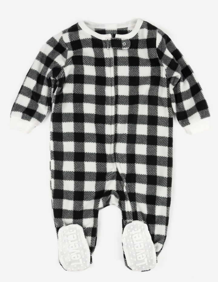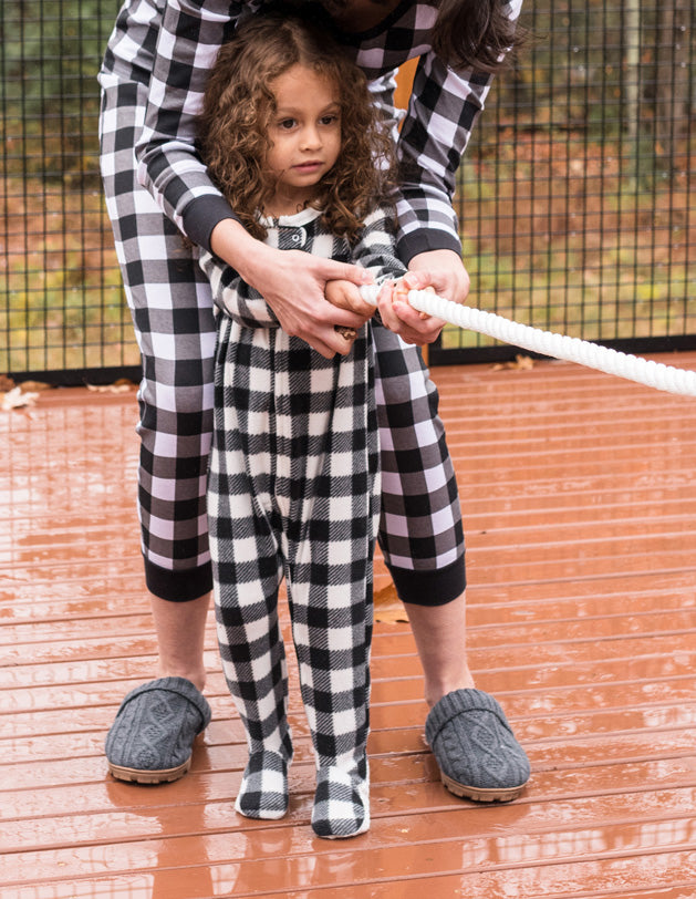 Kid's Footed Fleece Black & White Plaid Fleece Pajamas
