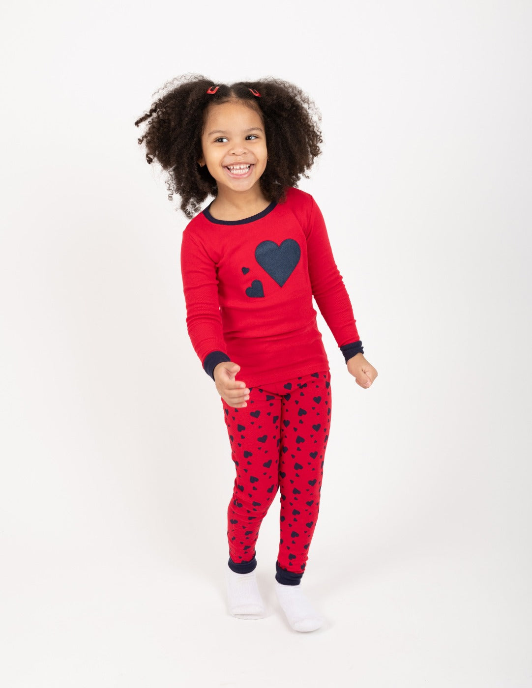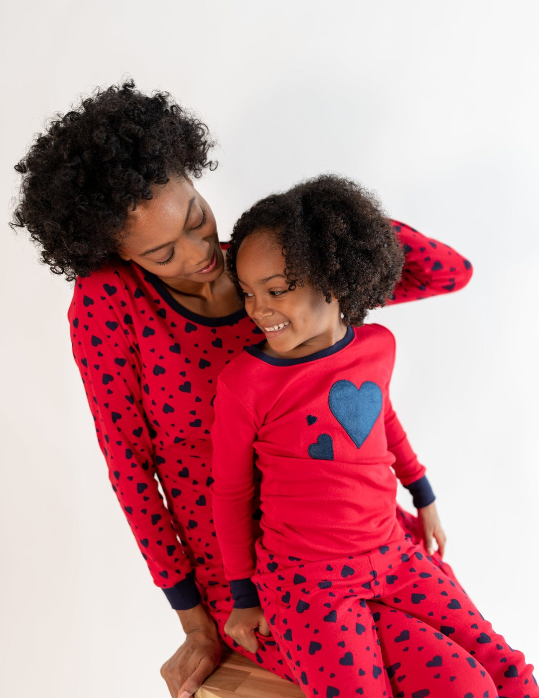 With the Kids Dark Navy Hearts Pajamas, every beloved child is bound to have a lovely Valentine’s Day. These special outfits have a unique design of navy hearts on a red background, ideal for all those matching occasions with the rest of the house. Sets come in a long-sleeved shirt with elastic bottoms, and both have ribbed cuffs at the ankles and wrists. Its 100% cotton material ensures a cozy feel, while the tagless labels prevent scratches on exposed skin. Sizes range from 12 months to 14 years old, and products are snug fitting for fire safety reasons. Your children are sure to have the most stylish look and comfort with the Kids Dark Navy Hearts Pajamas!