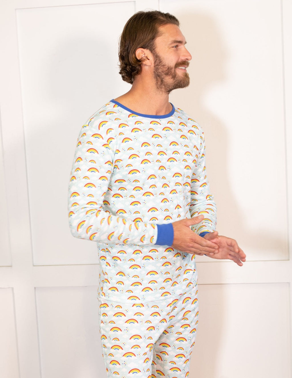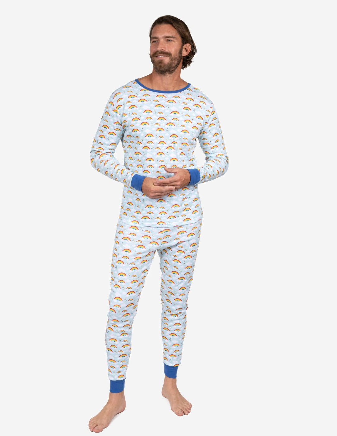 Whether for family photos, festive mornings, or everyday lounging, the Men’s Blue Rainbow Pajamas deliver fun, comfort, and easy matching.