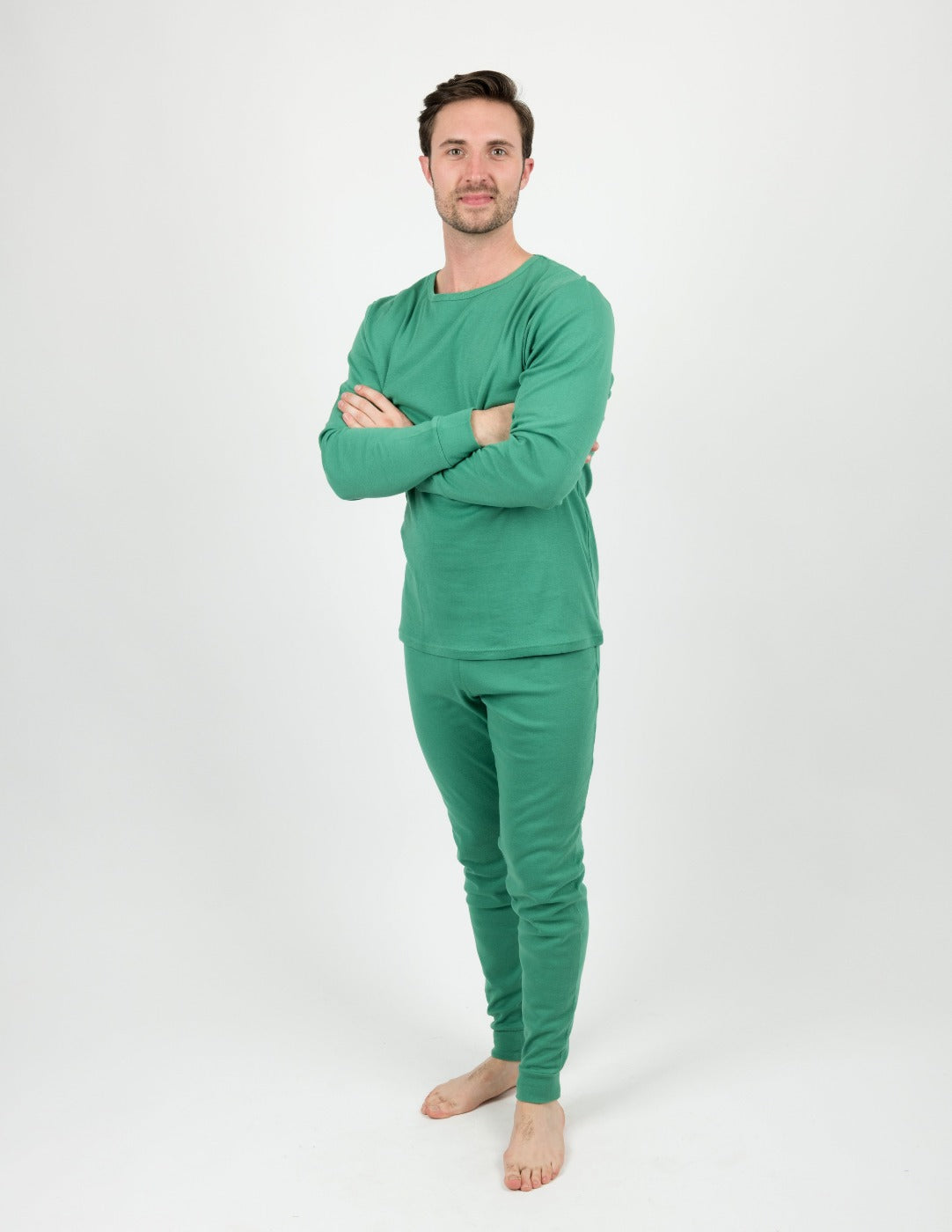 Every man will be able to match comfortably with the rest of their family in the Men’s Solid Green Pajamas. With its two-piece design and ribbed cuffs at the ankles and wrists, each outfit will be stylish for any special occasion. Pajamas come made with a 100% cotton material to complement the breathable, elastic waistband. The solid green color is bound to be the perfect addition to our other matching products. We offer sizes ranging from Small to XXX-Large, keep in mind outfits shrink after washing due to the cotton makeup. Tagless labels also ensure a scratch-free experience. As the weather starts to get colder, men can be guaranteed a cozy night of rest with the Men’s Solid Green Pajamas!