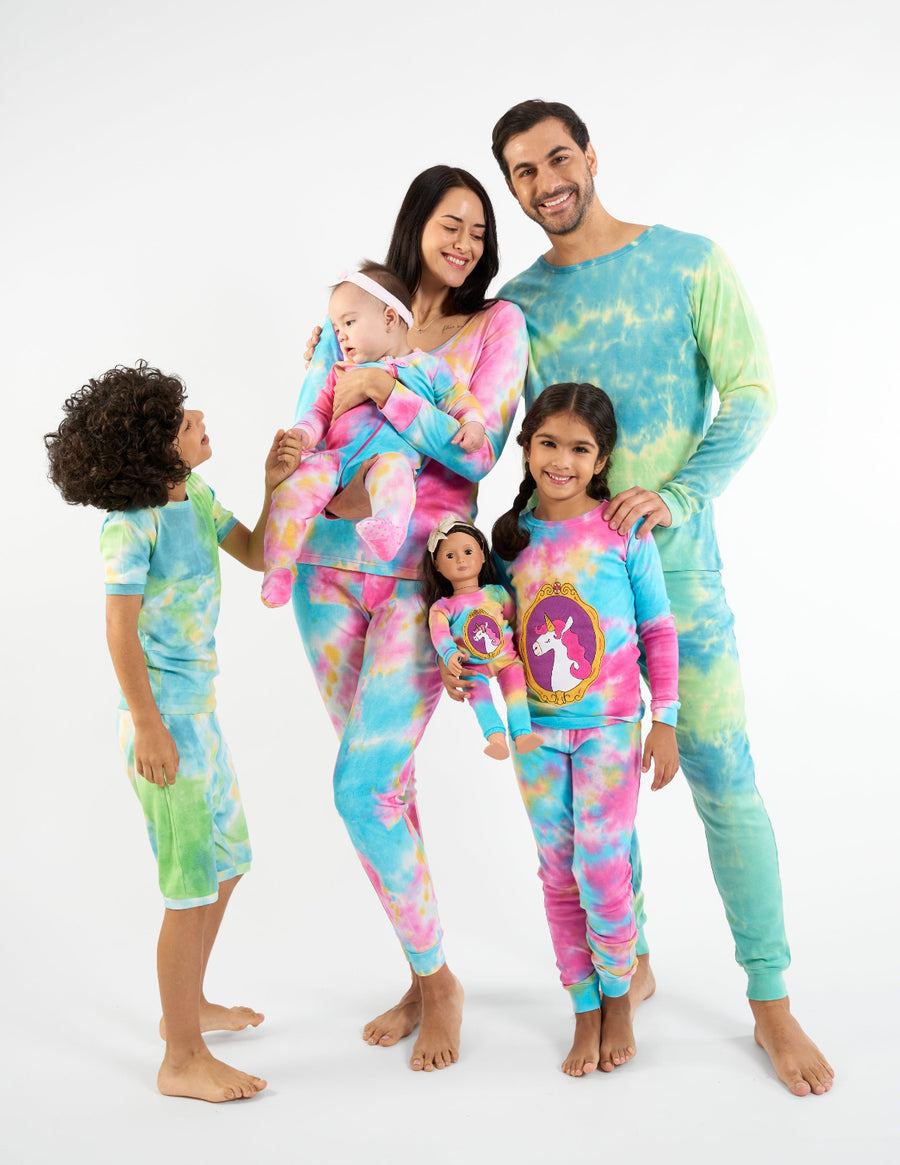 Families are guaranteed to match perfectly while getting a great night of rest with the Mixed Tie-Dye Set. With options offered for moms, dads, and kids, everyone will be included in the comfy fun. Pajama designs are made up of a tie-dye colored mix with a plethora of bright colors to choose from. Every pattern is uniquely dyed by hand, adding to its one-of-a-kind aspect. These products are slim-fitting with long sleeves and pants, combined with a comfortable elastic waistband. Ribbed cuffs at the ankles and wrists will ensure a secured feel and complement the soft 100% cotton makeup. Our children's pajamas also come with their own two-piece set or footed zip-up, and all of their outfits are snug-fitting to protect them from potential fire hazards. Due to the cotton makeup, keep in mind that pajamas will shrink after the first initial washes. Consider sizing up to accommodate a looser feel. The Mixed Tie-Dye Set will be a fantastic addition for any festive occasion, and the entire family will enjoy every comfortable moment!