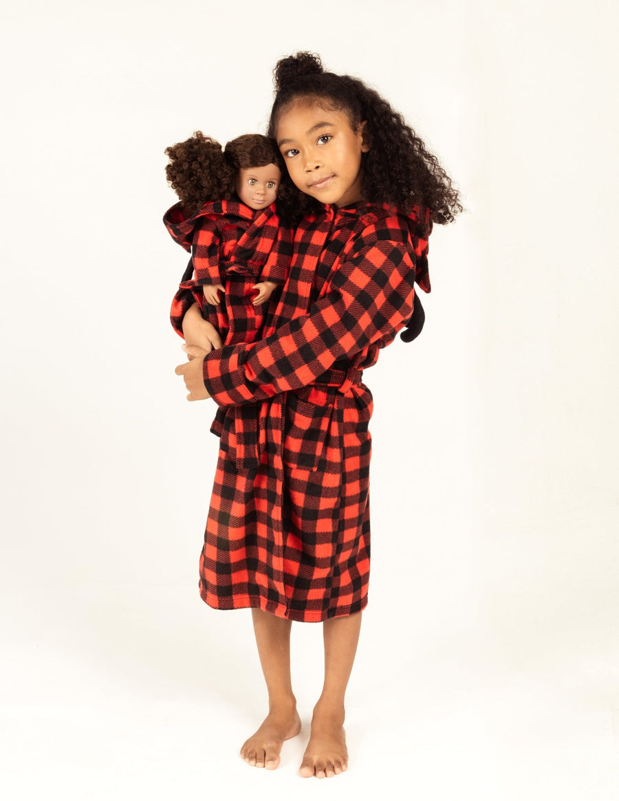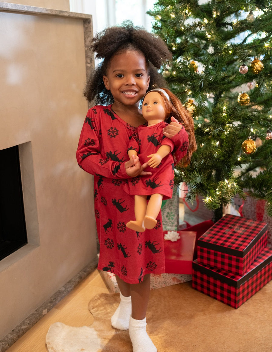 Girl and doll matching nightgowns, fleece robes, and zip-up footed pajamas with Leveret grips