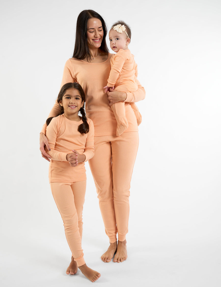 The Matching Family Solid Peach Pink pajama set is bound to provide moms and kids with the best sleep and match everyone well for any festive occasion. Its 100% cotton makeup and peach-colored design are sure to appease anyone, and the comfort of these pajamas is unmatched. The women’s choice is a slim fitted long sleeve set, including an elastic waistband that adds a breathable feeling at the hips. To add to the comfort while lounging around, there are ribbed cuffs at the ankles and wrists. Our kid's options also consist of a long sleeve two-piece set, and are made with a snug fit. Not only will it provide the utmost coziness, but it will also protect them against any potential fire hazards. Pajamas are also made with tagless labels to minimize annoying tag irritations on exposed skin. Any year-round holiday is sure to become even more memorable with the Matching Family Solid Peach Pink pajamas, and the family will love every comfortable minute!