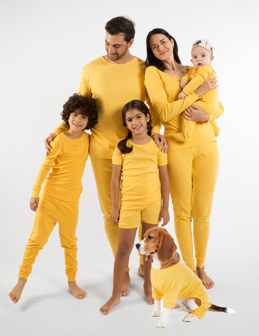 The Matching Family Solid Yellow pajamas will certainly brighten up any festive event or holiday. With the fluorescent solid yellow pattern across every pajama to complement the 100% cotton makeup, everyone is sure to enjoy these pajamas. Men’s and women’s pajamas are slim fit, with long sleeves and pants to provide the best warmth. They also come with ribbed ankle and wrist cuffs, along with a waistband to give wearers a more breathable feel. The children’s options feature two-piece long sleeves or a zip-up set with special Leveret footed grips to keep them warm and secure. All children’s pajamas are also designed to be a snug fit in order to protect them from possible fire hazards. There are even dog pajamas designed to keep your canine warm and matching with the rest of the family. Pajamas also implement tagless labels to prevent tag scratches on any exposed skin. Any holiday or special occasion will be unforgettable with the Matching Family Solid Yellow pajamas!