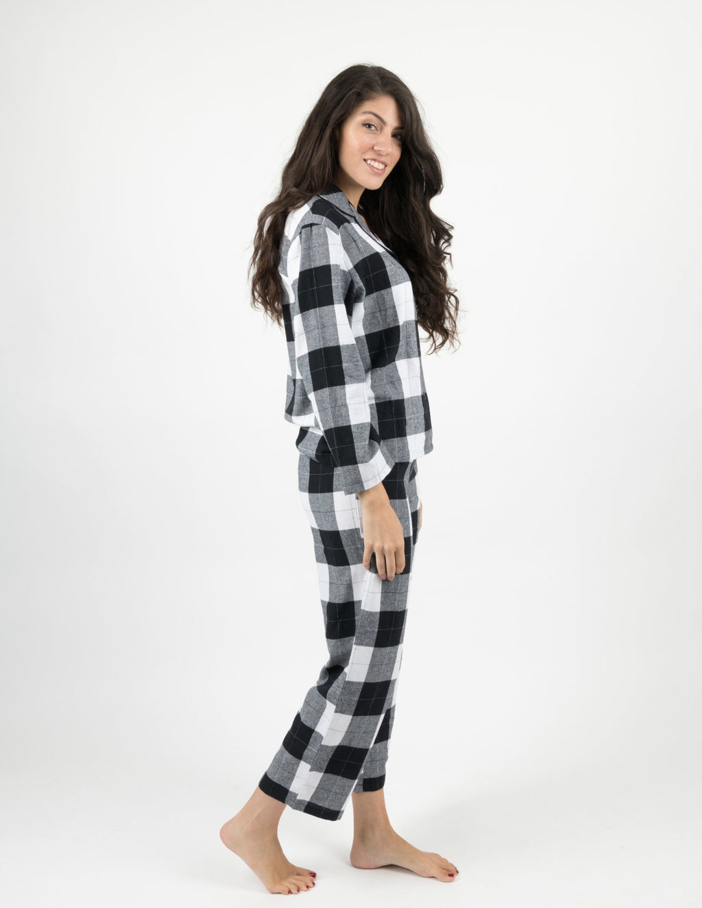 Matching with the rest of the house will be effortless fun in the Women’s Black & White Plaid Flannel Pajamas. Every woman is sure to love the stylish plaid design and the cozy 100% cotton material. These imported pajamas consist of a button-down top with loose-fitting pants. With this comfortable feel, these pajamas are perfect for the best night of rest or looking festive for any upcoming holiday. Our sizes are available in X-Small to XX-Large, however, consider sizing up to accommodate the shrinkable cotton material. The tagless labels will ensure no scratches on any exposed skin, and pajamas are machine wash cold inside out. The Women’s Black & White Plaid Flannel Pajamas will bring out the festive feelings in any family, and wearers will love every comfortable moment!
