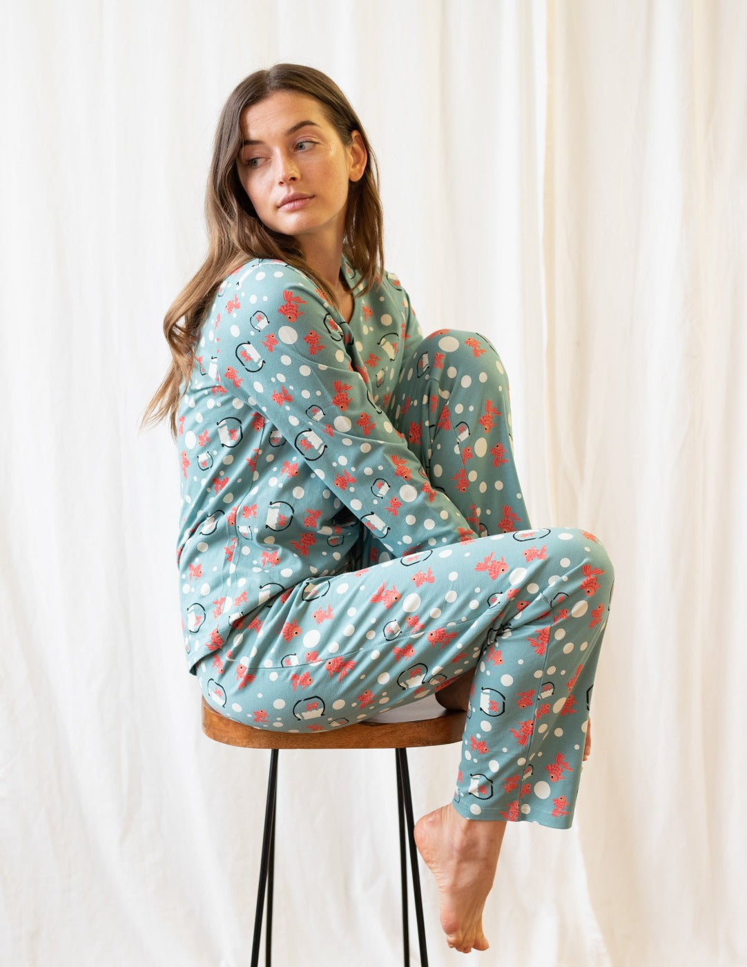 The Women’s Loose Fit Fish Bowl Pajamas are for the fish-lovers looking to get in touch with their aquatic side. Every imported product has an aqua-colored design of swimming goldfish, going well with the loose and comfortable fit. The 100% cotton makeup and elastic waistband also bolster the pajamas feel, and you will experience the best night of rest. The tagless labels also ensure that exposed skin shall remain scratch-free. Our sizes are offered from X-Small to X-Large, however, outfits will shrink 1-3 inches after the first initial washings. We recommend a size up for those who crave a looser fit. Women’s Loose Fit Fish Bowl Pajamas will match effortlessly with the other fish-themed sets, and the whole family will be able to match for those memorable celebrations and photos! Nothing will be more precious than a matching photoshoot with everybody!