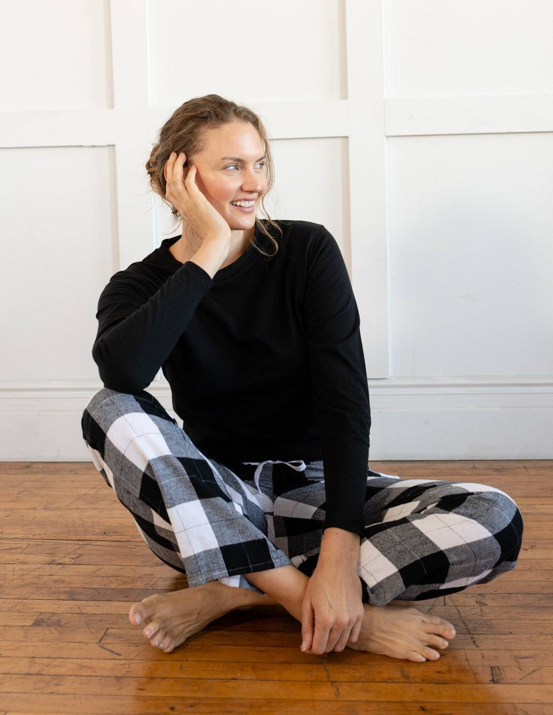 The Women’s Black & White Plaid Flannel Pajama Set will be the ideal set for any woman seeking a comfortable night of rest. Each imported product features a two-piece set with a long-sleeved black shirt and plaid-patterned pants. Both pieces have a 100% cotton makeup guaranteed to provide a snug experience for sleeping or lounging around the house. With a loose fit overall to complement its elastic waistband, wearers are bound to adore every comfortable moment in these pajamas. Our sizes are offered from X-Small to 5XL, keep in mind that the cotton material will shrink after the first washes. Tagless labels will make sure that exposed skin remains scratch-free, and products are machine wash cold inside out. Every festive occasion will be even more memorable with the Women’s Black & White Plaid Flannel Pajama Set, and matching has never been easier!